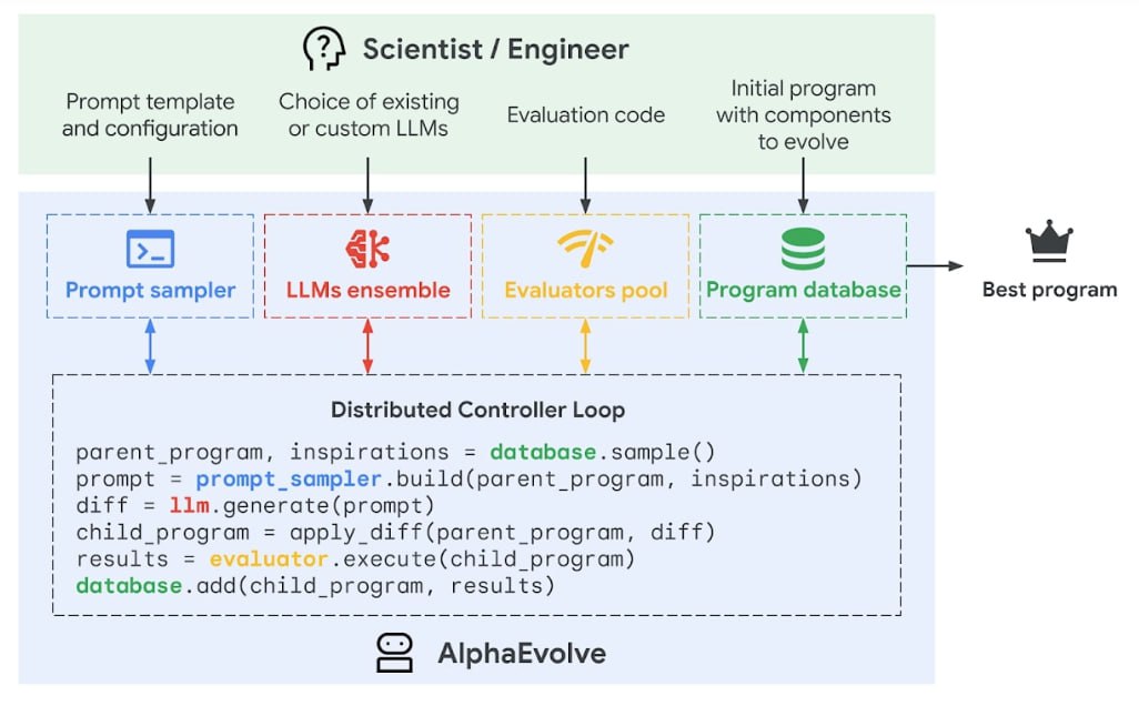 AlphaEvolve is not a single “AI tool” but a framework: you give it (i) a code skeleton or family of baseline algorithms and, (ii) a deterministic function that scores each candidate.