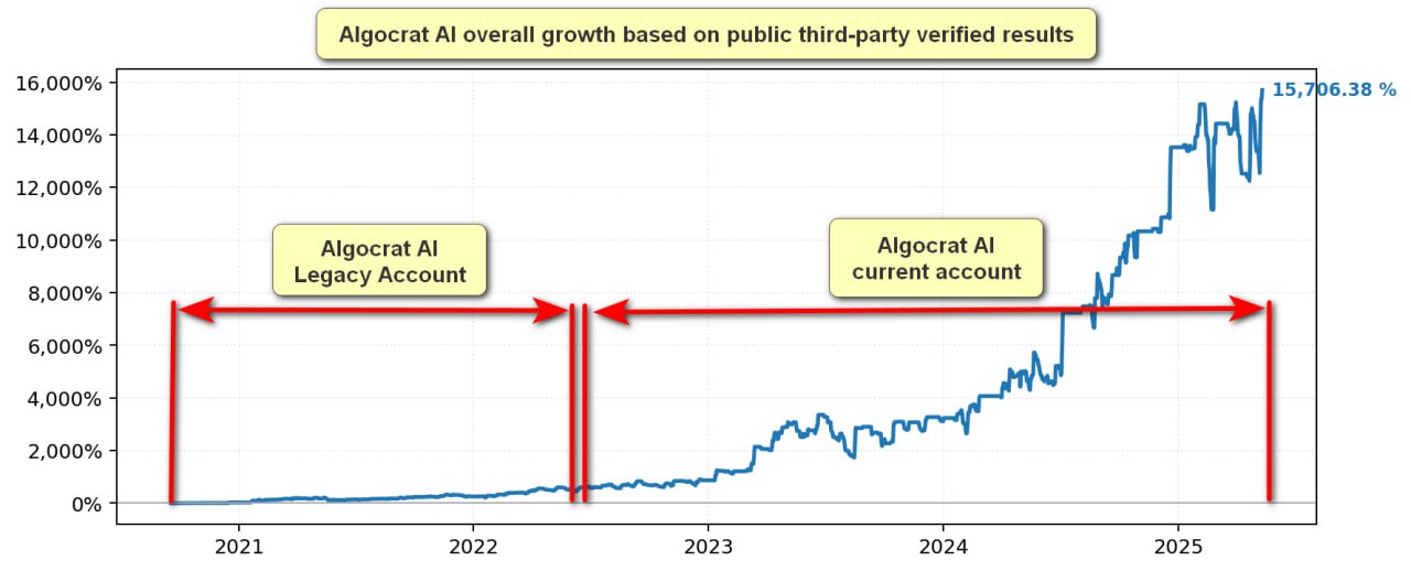Algocrat AI has been trading publicly since 2020, as you can check in our Myfxbook account.