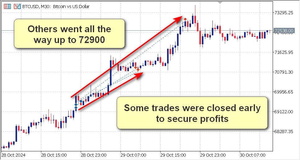 Some exited early, locking in profits, while others continued to ride the trend, exiting close to the peak at 72,900: