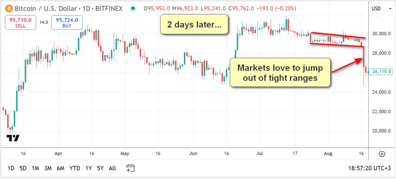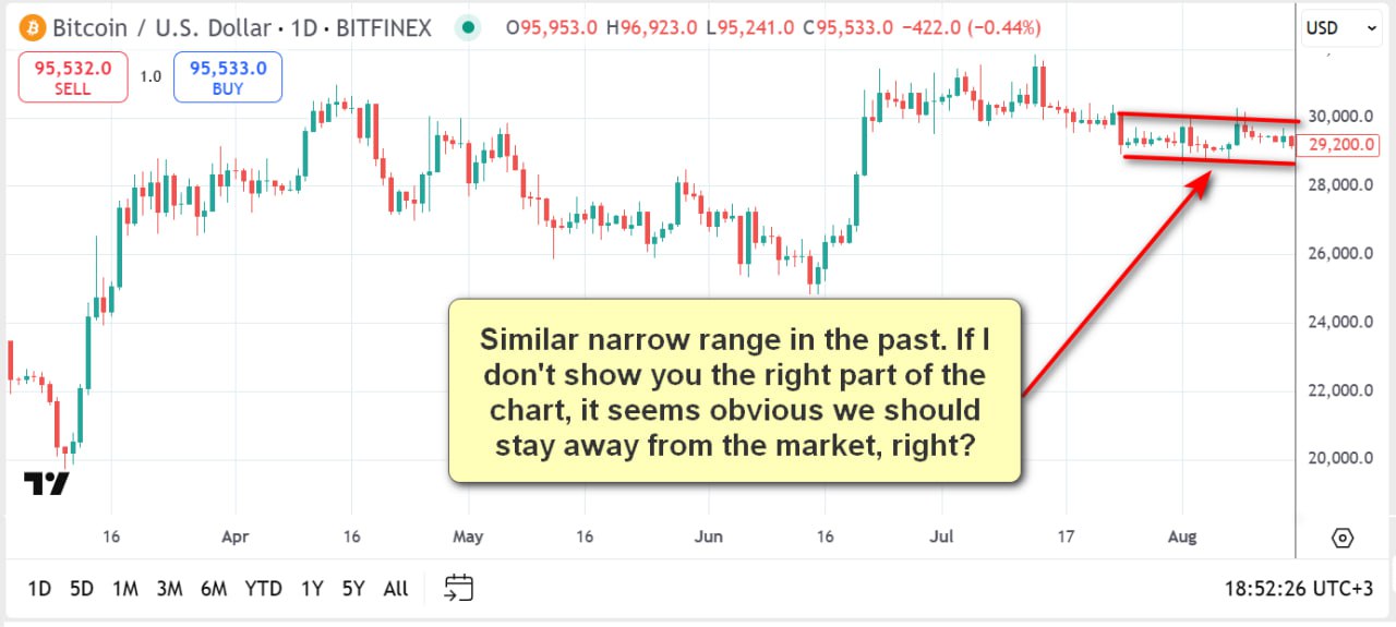 In August 2023, Bitcoin moved sideways for several weeks, similar to what’s happening now. Many traders might have thought it was wise to pause trading: