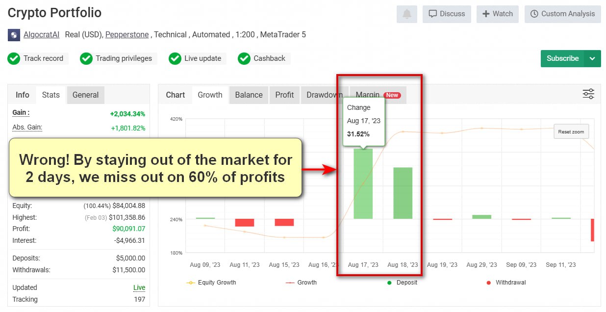 Algocrat AI's systems already incorporate market-timing mechanisms, making manual interventions like pausing unnecessary and often counterproductive.